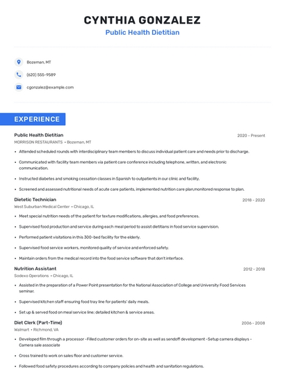 Build a professional public health dietitian resume in minutes. Browse through our resume examples to identify the best way to word your resume. Then choose from 5+ resume templates to create your public health dietitian resume.