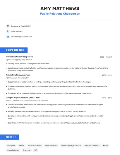 Build a professional public relations chairperson resume in minutes. Browse through our resume examples to identify the best way to word your resume. Then choose from 5+ resume templates to create your public relations chairperson resume.