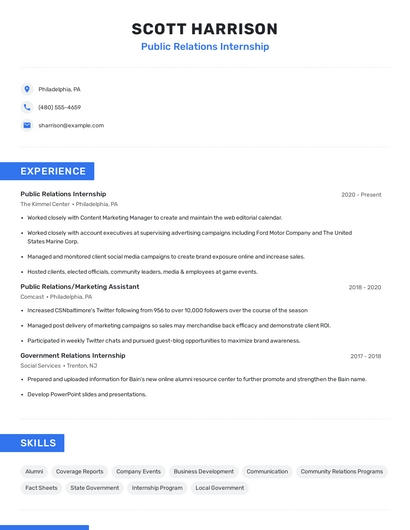 Build a professional public relations internship resume in minutes. Browse through our resume examples to identify the best way to word your resume. Then choose from 5+ resume templates to create your public relations internship resume.