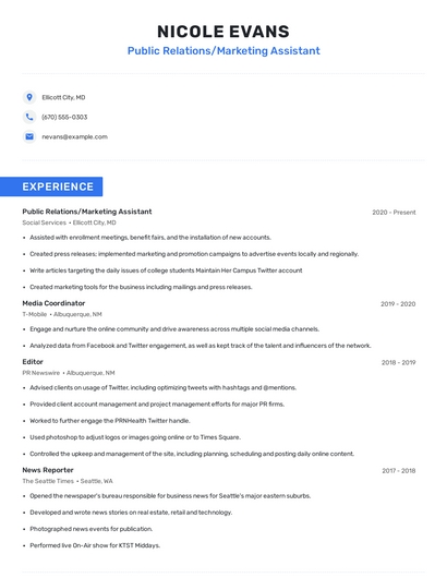 Build a professional public relations/marketing assistant resume in minutes. Browse through our resume examples to identify the best way to word your resume. Then choose from 5+ resume templates to create your public relations/marketing assistant resume.