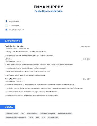 Build a professional public services librarian resume in minutes. Browse through our resume examples to identify the best way to word your resume. Then choose from 5+ resume templates to create your public services librarian resume.