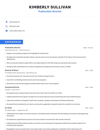 Build a professional publication director resume in minutes. Browse through our resume examples to identify the best way to word your resume. Then choose from 5+ resume templates to create your publication director resume.