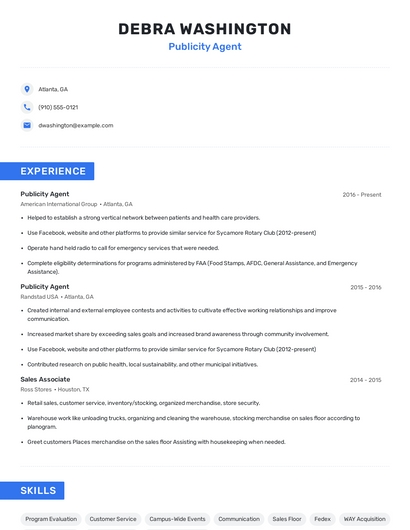 Build a professional publicity agent resume in minutes. Our AI resume writing assistant will guide you through every step of the process, and you can choose from 10+ resume templates to create your publicity agent resume.7. Notary