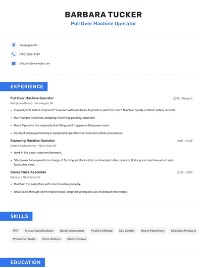 The most important skills for a pull over machine operator resume and required skills for a pull over machine operator to have include:
