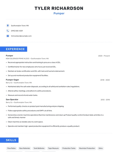 Build a professional pumper resume in minutes. Browse through our resume examples to identify the best way to word your resume. Then choose from 5+ resume templates to create your pumper resume.
