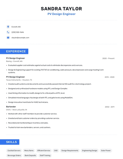 Build a professional pv design engineer resume in minutes. Browse through our resume examples to identify the best way to word your resume. Then choose from 5+ resume templates to create your pv design engineer resume.