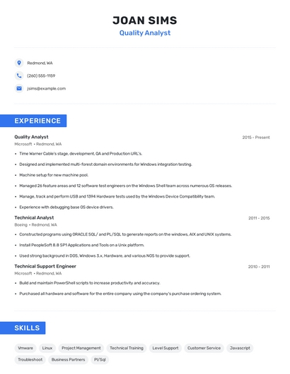 Build a professional quality analyst resume in minutes. Browse through our resume examples to identify the best way to word your resume. Then choose from 5+ resume templates to create your quality analyst resume.