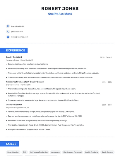 Build a professional quality assistant resume in minutes. Browse through our resume examples to identify the best way to word your resume. Then choose from 5+ resume templates to create your quality assistant resume.