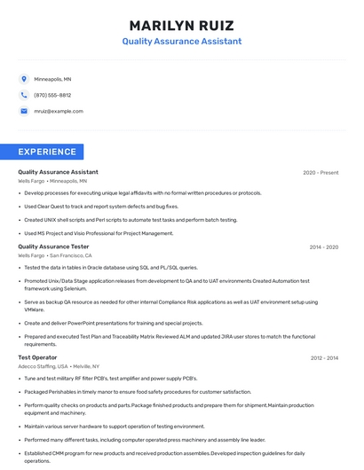 Build a professional quality assurance assistant resume in minutes. Browse through our resume examples to identify the best way to word your resume. Then choose from 5+ resume templates to create your quality assurance assistant resume.