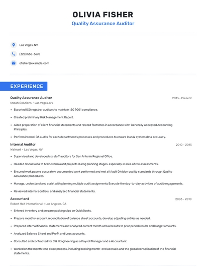 Build a professional quality assurance auditor resume in minutes. Browse through our resume examples to identify the best way to word your resume. Then choose from 5+ resume templates to create your quality assurance auditor resume.