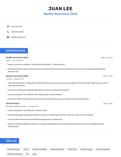 Build a professional quality assurance clerk resume in minutes. Browse through our resume examples to identify the best way to word your resume. Then choose from 5+ resume templates to create your quality assurance clerk resume.