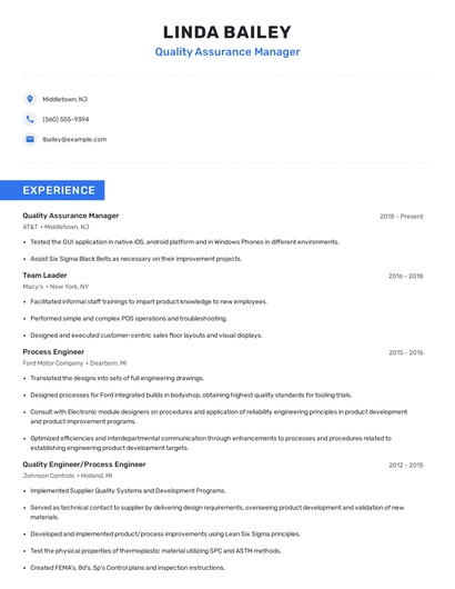 Build a professional quality assurance manager resume in minutes. Browse through our resume examples to identify the best way to word your resume. Then choose from 5+ resume templates to create your quality assurance manager resume.