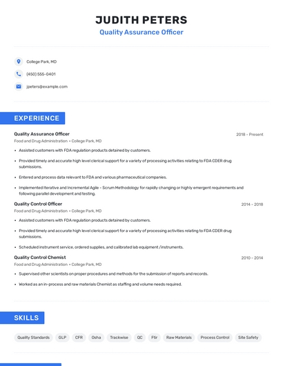 Build a professional quality assurance officer resume in minutes. Browse through our resume examples to identify the best way to word your resume. Then choose from 5+ resume templates to create your quality assurance officer resume.