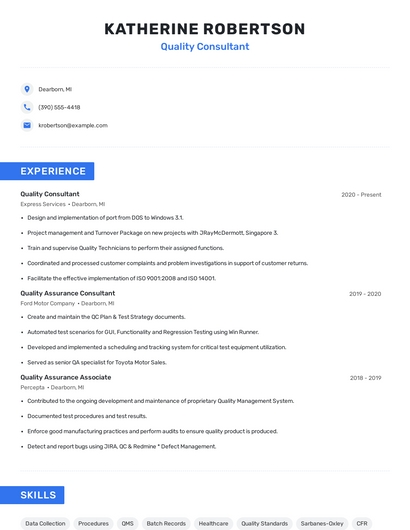 Build a professional quality consultant resume in minutes. Browse through our resume examples to identify the best way to word your resume. Then choose from 5+ resume templates to create your quality consultant resume.