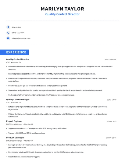 Build a professional quality control director resume in minutes. Browse through our resume examples to identify the best way to word your resume. Then choose from 5+ resume templates to create your quality control director resume.