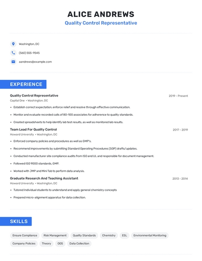 Build a professional quality control representative resume in minutes. Browse through our resume examples to identify the best way to word your resume. Then choose from 5+ resume templates to create your quality control representative resume.