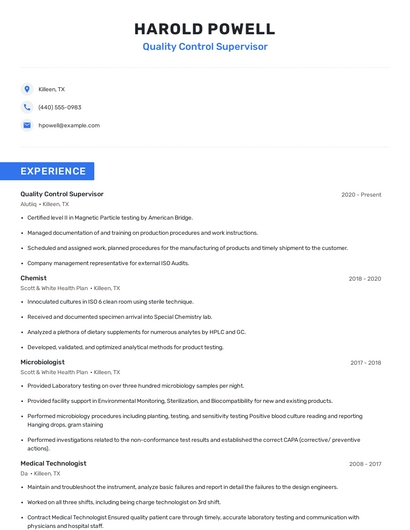 Build a professional quality control supervisor resume in minutes. Browse through our resume examples to identify the best way to word your resume. Then choose from 5+ resume templates to create your quality control supervisor resume.