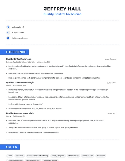 Build a professional quality control technician resume in minutes. Browse through our resume examples to identify the best way to word your resume. Then choose from 5+ resume templates to create your quality control technician resume.