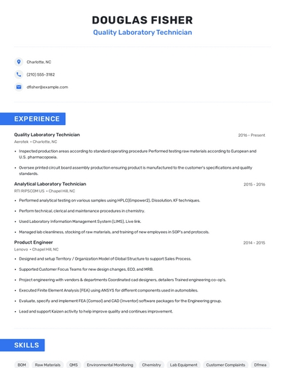 Build a professional quality laboratory technician resume in minutes. Browse through our resume examples to identify the best way to word your resume. Then choose from 5+ resume templates to create your quality laboratory technician resume.