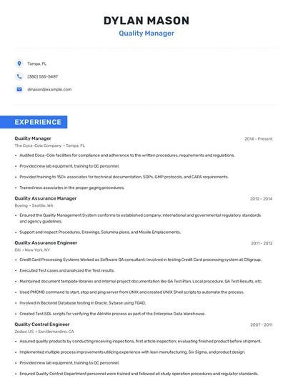 Build a professional quality manager resume in minutes. Browse through our resume examples to identify the best way to word your resume. Then choose from 5+ resume templates to create your quality manager resume.