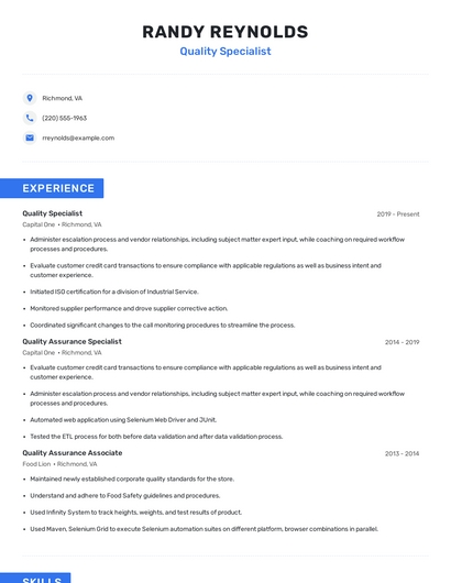 Build a professional quality specialist resume in minutes. Browse through our resume examples to identify the best way to word your resume. Then choose from 5+ resume templates to create your quality specialist resume.