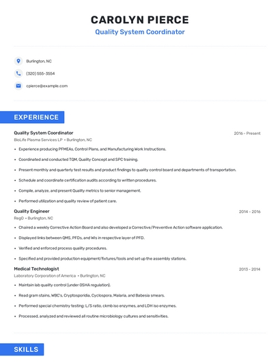 Build a professional quality system coordinator resume in minutes. Browse through our resume examples to identify the best way to word your resume. Then choose from 5+ resume templates to create your quality system coordinator resume.