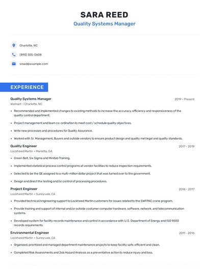 Build a professional quality systems manager resume in minutes. Browse through our resume examples to identify the best way to word your resume. Then choose from 5+ resume templates to create your quality systems manager resume.