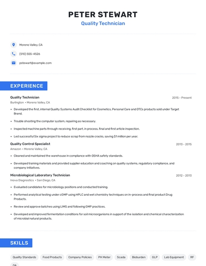 Build a professional quality technician resume in minutes. Browse through our resume examples to identify the best way to word your resume. Then choose from 5+ resume templates to create your quality technician resume.