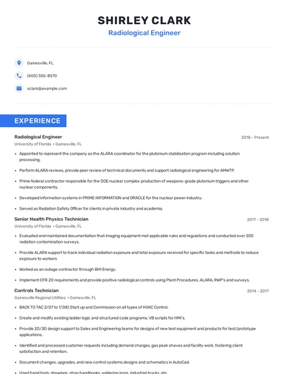 Build a professional radiological engineer resume in minutes. Browse through our resume examples to identify the best way to word your resume. Then choose from 5+ resume templates to create your radiological engineer resume.