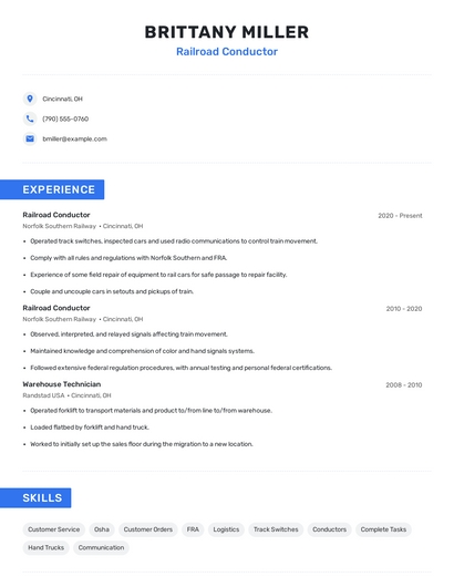 Build a professional railroad conductor resume in minutes. Browse through our resume examples to identify the best way to word your resume. Then choose from 5+ resume templates to create your railroad conductor resume.