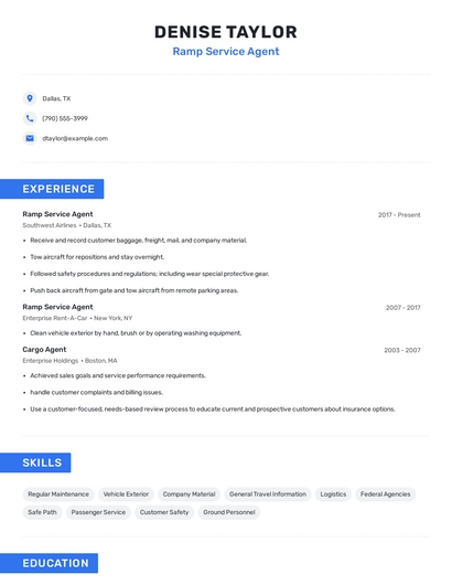 Build a professional ramp service agent resume in minutes. Browse through our resume examples to identify the best way to word your resume. Then choose from 5+ resume templates to create your ramp service agent resume.