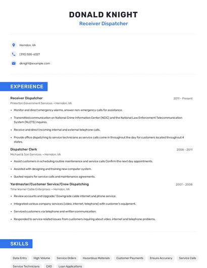 Build a professional receiver dispatcher resume in minutes. Browse through our resume examples to identify the best way to word your resume. Then choose from 5+ resume templates to create your receiver dispatcher resume.