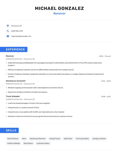 Build a professional receiver resume in minutes. Browse through our resume examples to identify the best way to word your resume. Then choose from 5+ resume templates to create your receiver resume.