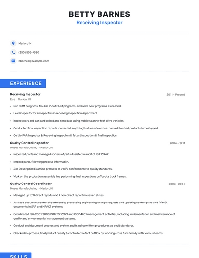 Build a professional receiving inspector resume in minutes. Browse through our resume examples to identify the best way to word your resume. Then choose from 5+ resume templates to create your receiving inspector resume.