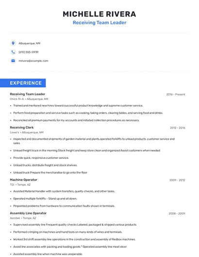Build a professional receiving team leader resume in minutes. Browse through our resume examples to identify the best way to word your resume. Then choose from 5+ resume templates to create your receiving team leader resume.