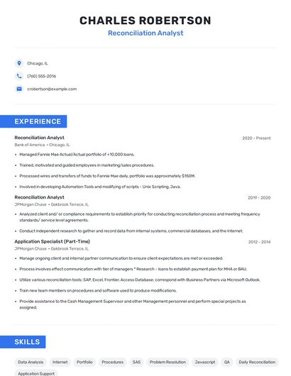 Build a professional reconciliation analyst resume in minutes. Browse through our resume examples to identify the best way to word your resume. Then choose from 5+ resume templates to create your reconciliation analyst resume.