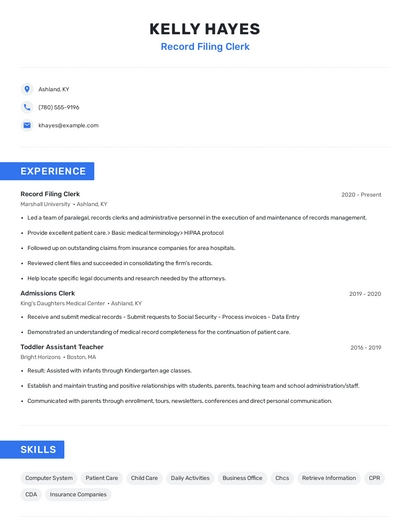 Build a professional record filing clerk resume in minutes. Browse through our resume examples to identify the best way to word your resume. Then choose from 5+ resume templates to create your record filing clerk resume.