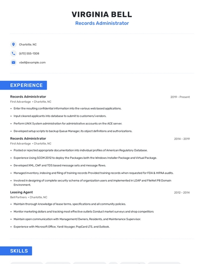 Build a professional records administrator resume in minutes. Browse through our resume examples to identify the best way to word your resume. Then choose from 5+ resume templates to create your records administrator resume.