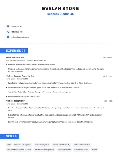 Build a professional records custodian resume in minutes. Browse through our resume examples to identify the best way to word your resume. Then choose from 5+ resume templates to create your records custodian resume.