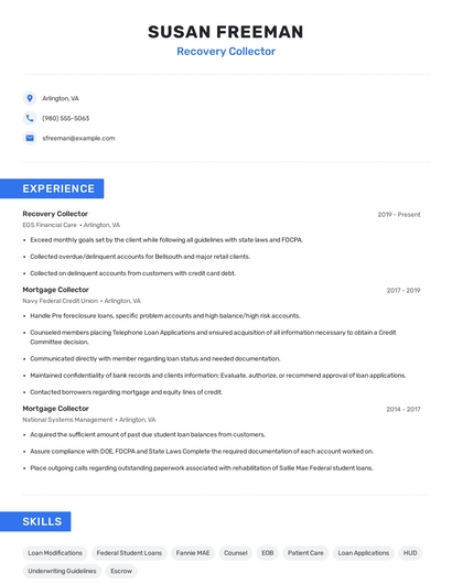 Build a professional recovery collector resume in minutes. Browse through our resume examples to identify the best way to word your resume. Then choose from 5+ resume templates to create your recovery collector resume.