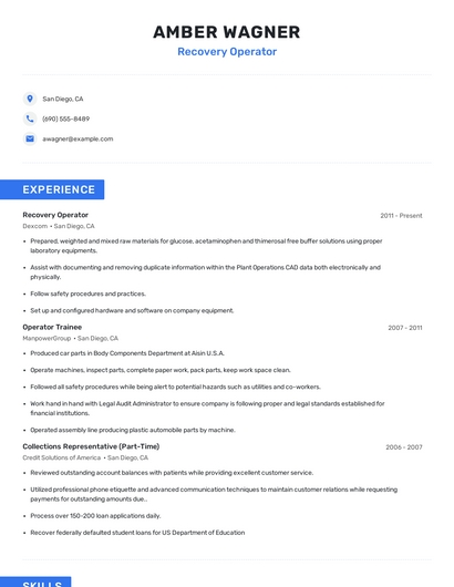 Build a professional recovery operator resume in minutes. Browse through our resume examples to identify the best way to word your resume. Then choose from 5+ resume templates to create your recovery operator resume.