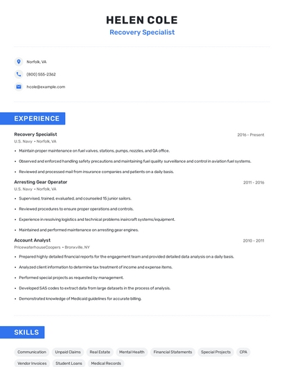 Build a professional recovery specialist resume in minutes. Browse through our resume examples to identify the best way to word your resume. Then choose from 5+ resume templates to create your recovery specialist resume.