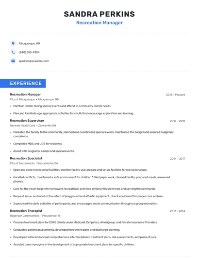 Build a professional recreation manager resume in minutes. Our AI resume writing assistant will guide you through every step of the process, and you can choose from 10+ resume templates to create your recreation manager resume.7. Direct Reports