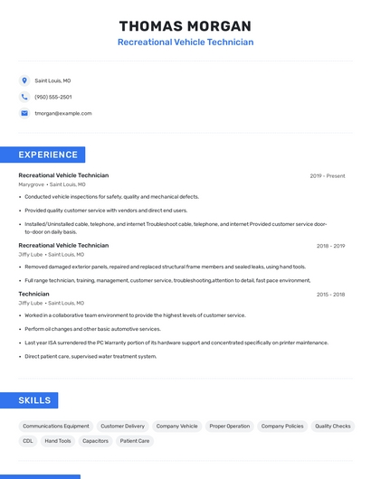 Choose from 10+ customizable recreational vehicle technician resume templates