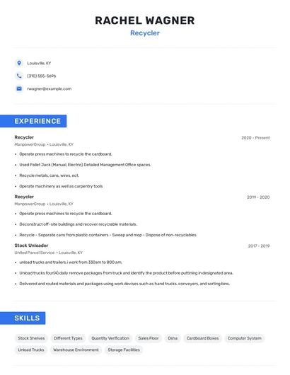 Build a professional recycler resume in minutes. Browse through our resume examples to identify the best way to word your resume. Then choose from 5+ resume templates to create your recycler resume.