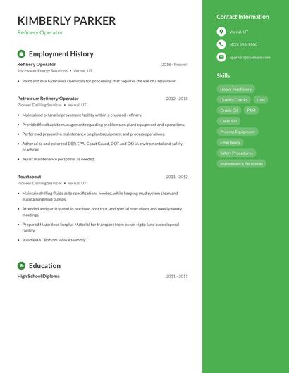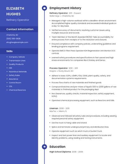 You can use Zippia's AI resume builder to make the resume writing process easier while also making sure that you include key information that hiring managers expect to see on a refinery operator resume. You'll find resume tips and examples of skills, responsibilities, and summaries, all provided by Zippi, your career sidekick.
