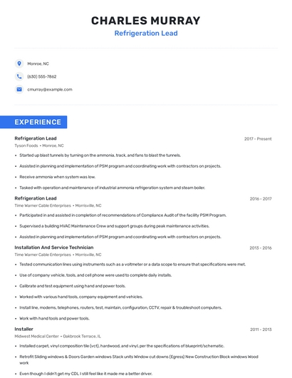 Build a professional refrigeration lead resume in minutes. Our AI resume writing assistant will guide you through every step of the process, and you can choose from 10+ resume templates to create your refrigeration lead resume.7. Industrial Refrigeration