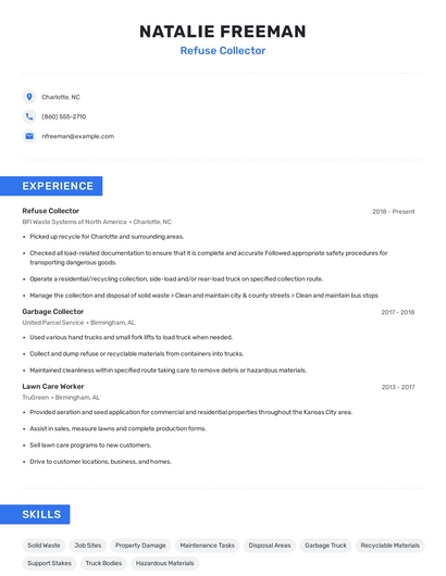 Build a professional refuse collector resume in minutes. Browse through our resume examples to identify the best way to word your resume. Then choose from 5+ resume templates to create your refuse collector resume.