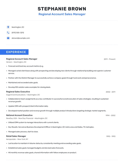 Build a professional regional account sales manager resume in minutes. Browse through our resume examples to identify the best way to word your resume. Then choose from 5+ resume templates to create your regional account sales manager resume.