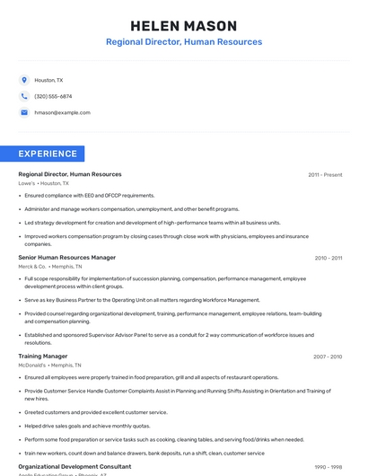 Build a professional regional director, human resources resume in minutes. Browse through our resume examples to identify the best way to word your resume. Then choose from 5+ resume templates to create your regional director, human resources resume.